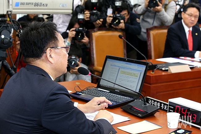 11일, 서울 여의도 국회서 열린 유일호 경제부총리 겸 기획재정부장관 후보자가 인사청문회에서 한 의원의 질의에 답변하고 있다.