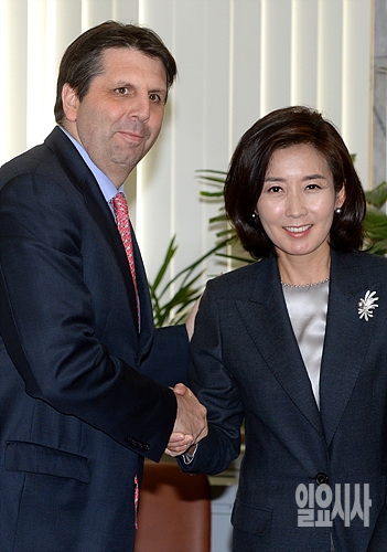 11일, 서울 여의도 국회 외교통상통일위원회 위원장실에서 나경원 외통위원장(사진 오른쪽)과 마크 리퍼트 주한미국대사가 악수를 나누고 있다.