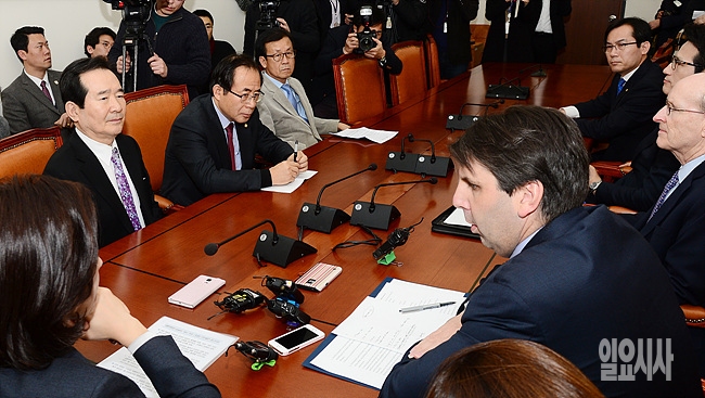11일, 서울 여의도 국회 외교통상통일위원회 소회의실에서 나경원 외통위원장, 더민주당 정세균, 원혜영 의원 등이 마크 리퍼트 주한미국대사과 간담회를 갖고 있다.
