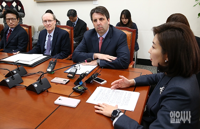 11일, 서울 여의도 국회 외교통상통일위원회 소회의실에서 나경원 외통위원장(사진 오른쪽)이 정병국 새누리당 의원, 정세균 더민주당 의원 등 외통위원들, 마크 리퍼트 주한미국대사 등이 참석해 간담회가 열리고 있는 가운데 발언을 하고 있다.