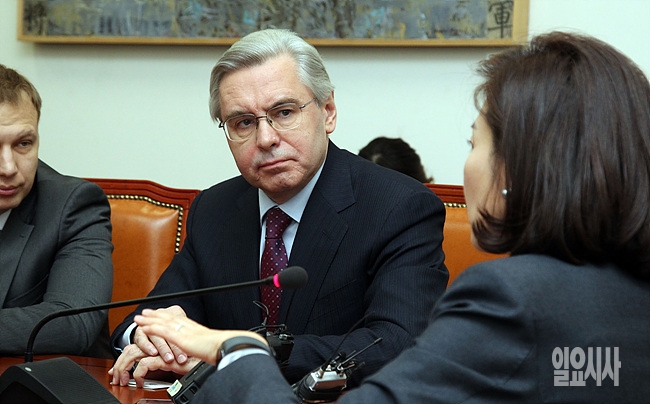 11일, 서울 여의도 국회 외교통상통일위원회 소회의실에서 나경원 외통위원장(사진 오른쪽)이 발언하고 있는 가운데, 알렉산드르 티모닌 주한 러시아대사가 발언을 경청하고 있다.