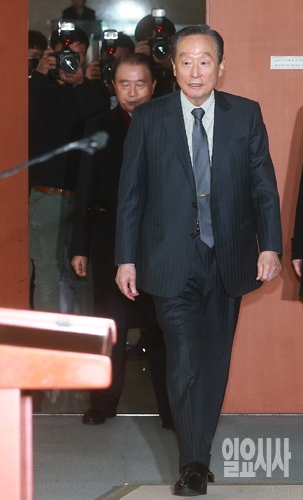 권노갑 더불어민주당 상임고문이 12일 오전 서울 여의도 국회 정론관 기자회견장에서 가진 더불어민주당 탈당 기자회견에 입장하고 있다.