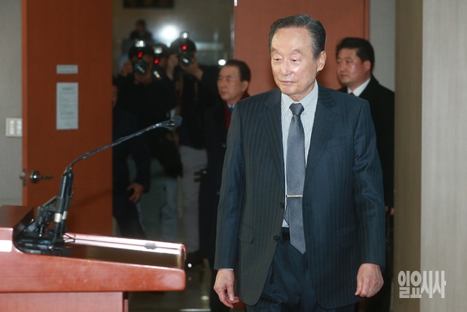 권노갑 더불어민주당 상임고문이 12일 오전 서울 여의도 국회 정론관 기자회견장에서 가진 더불어민주당 탈당 기자회견에 입장하고 있다.
