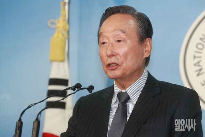권노갑 더불어민주당 상임고문이 12일 오전 서울 여의도 국회 정론관 기자회견장에서 더불어민주당 탈당 기자회견을 갖고 있다.