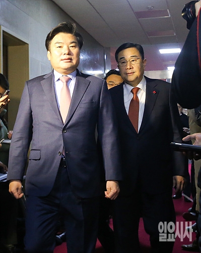 18일, 새누리당 원유철 원내대표(사진 왼쪽)과 김정훈 정책위의장이 정의화 국회의장 주재 '3+3 여야 회동'을 위해 서울 여의도 국회 의장접견실로 이동하고 있다.