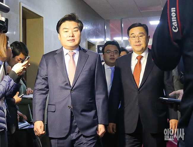 18일, 새누리당 원유철 원내대표(사진 왼쪽)과 김정훈 정책위의장이 정의화 국회의장 주재 '3+3 여야 회동'을 위해 서울 여의도 국회 의장접견실로 이동하고 있다.