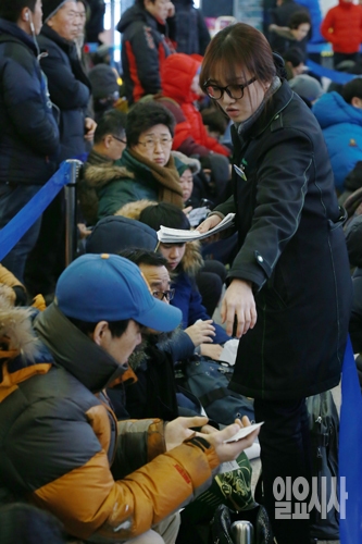 구정 설 귀성열차 표 현장예매가 시작된 19일 오전 서울역 매표소 앞에 귀성열차 표를 구하기 위해 밤새 줄을 선 시민들에게 코레일 직원이 승차권 구입 신청서를 나눠주고 있다.