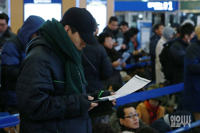 구정 설 귀성열차 표 현장예매가 시작된 19일 오전 서울역 매표소 앞에 귀성열차 표를 구하기 위해 밤새 줄을 선 시민들이 열차 시간표를 보고 있다.