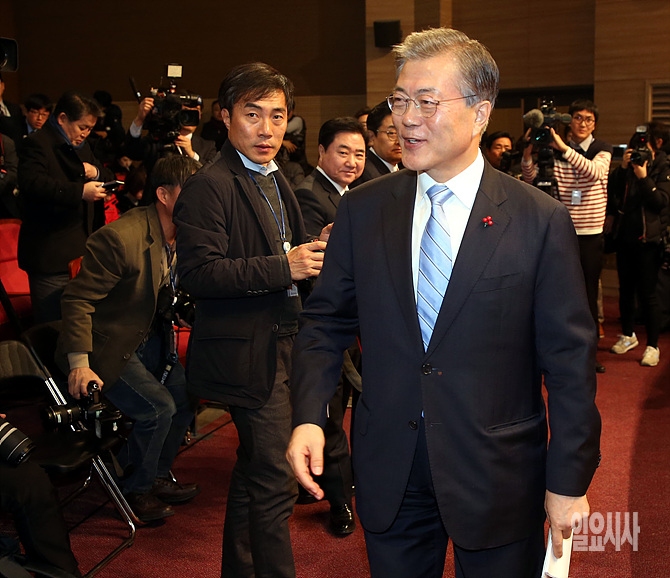 19일, 서울 여의도 국회서 더불어민주당 문재인 대표가 2016 신년 기자회견에 앞서 입장을 하고 있다.