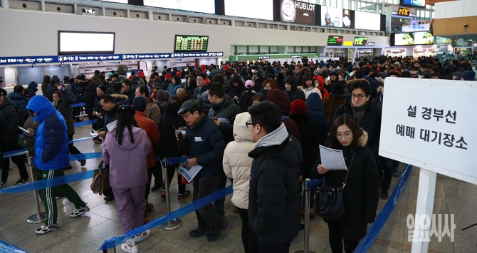 구정 설 귀성열차 표 현장예매가 시작된 19일 오전 서울역 매표소 앞에 귀성열차 표를 구하기 위해 시민들이 줄을 서있다.