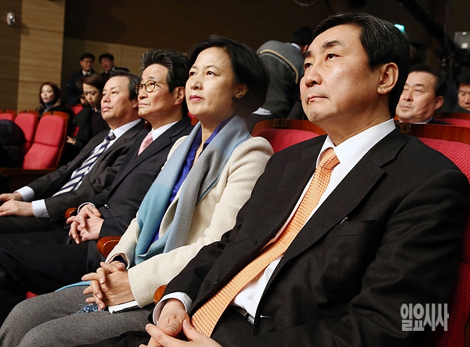 19일, 서울 여의도 국회서 더불어민주당 문재인 대표가 2016 신년 기자회견을 갖고 있는 가운데, 이종걸 원내대표(사진 오른쪽), 추미애 최고위원(오른쪽서 두 번째), 이목희 정책위의장 등이 참석해 있다.