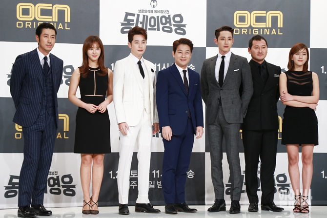 배우 윤태영, 권유리, 박시후, 조성하, 이수혁, 정만식, 최윤소(왼쪽부터)가 19일 오후 서울 영등포 타임스퀘어 아모리스홀에서 열린 OCN 주말드라마 <동네의 영웅> 제작발표회에서 포토타임을 갖고 있다.
