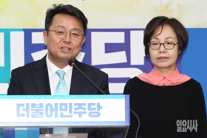 이철희 두문정치연구소장과 권미혁 여성단체연합회 대표가 20일 오전 서울 여의도 국회에서 열린 더불어민주당 이철희 두문정치연구소 소장, 권미혁 여성단체연합회 대표 영입 기자회견에서 기자들의 질문에 답변하고 있다.