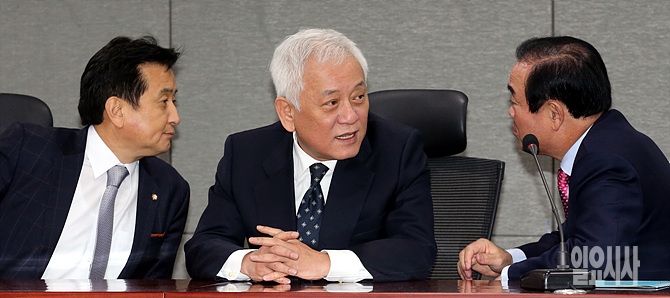 20일, 서울 여의도 국회 의원회관서 국민의당(가칭) 첫 의원단 회의가 열린 가운데, 김한길 의원(사진 가운데)과 김영환(왼쪽)·장병완 의원이 이야기를 나누고 있다.