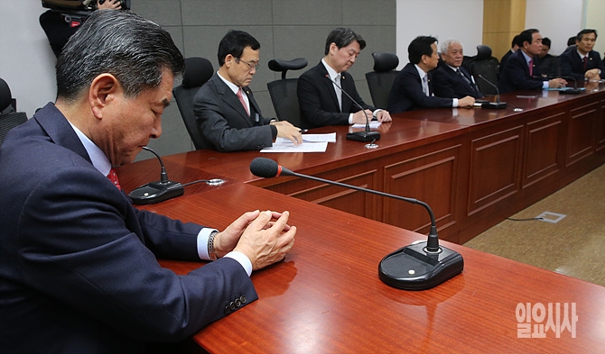 20일, 서울 여의도 국회 의원회관서 국민의당(가칭) 첫 의원단 회의가 열린 가운데, 서울종합예술실용학교 입법비리 혐의로 실형을 선고받은 바 있는 신학용 전 더불어민주당 의원(사진 왼쪽)이 깊은 생각에 빠져 있다.