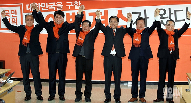 20일, 천정배 국민회의(가칭) 창당준비위원장(사진 오른쪽서 세 번째), 정광호 전 한국노총 사무처장(왼쪽), 지재석 전 IT연맹 위원장(왼쪽서 두 번째) 등이 참석한 가운데, 서울 여의도 국민회의 당사에서 인재입당식 직후 만세를 하고 있다.