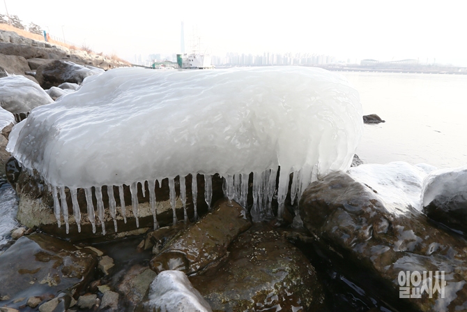 서울 최저기온이 영하 14도를 기록하며 사흘째 한파주의보가 계속되고 있는 가운데 20일 오후 서울 광진구 뚝섬 한강공원 앞 한강에 얼음이 얼어 있다.