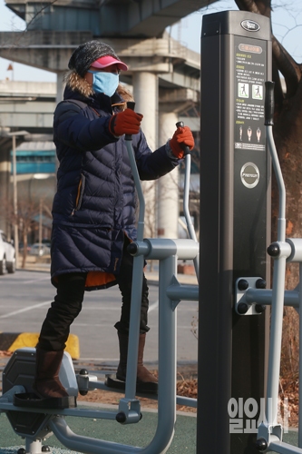 서울 최저기온이 영하 14도를 기록하며 사흘째 한파주의보가 계속되고 있는 가운데 20일 오후 서울 광진구 뚝섬 한강공원에서 한 시민이 영하의 추위에도 마스크를 쓴 채 운동을 하고 있다.