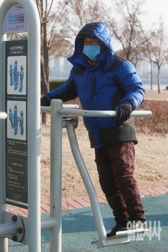 서울 최저기온이 영하 14도를 기록하며 사흘째 한파주의보가 계속되고 있는 가운데 20일 오후 서울 광진구 뚝섬 한강공원에서 한 시민이 영하의 추위에도 마스크를 쓴 채 운동을 하고 있다.