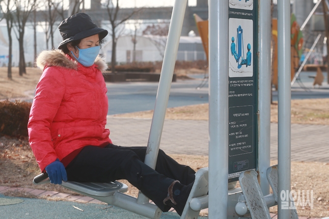 서울 최저기온이 영하 14도를 기록하며 사흘째 한파주의보가 계속되고 있는 가운데 20일 오후 서울 광진구 뚝섬 한강공원에서 한 시민이 영하의 추위에도 마스크를 쓴 채 운동을 하고 있다.