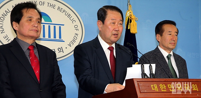 20일, 박주선 무소속 의원(사진 가운데)이 서울 여의도 국회 정론관에서 장세환 전 더불어민주당 의원(왼쪽) 등과 함께 인재영입 기자회견을 갖고 있다.