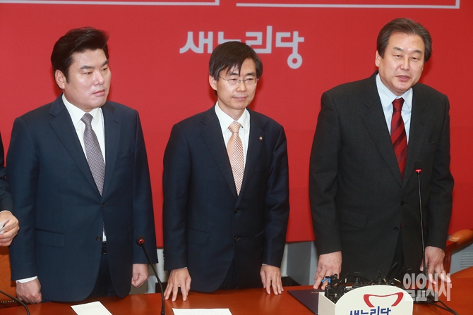 김무성 새누리당 대표가 21일 오전 서울 여의도 국회에서 열린 더불어민주당을 탈당하고 새누리당에 입당한 조경태 의원의 새누리당 입당식에서 인사말을 하고 있다.